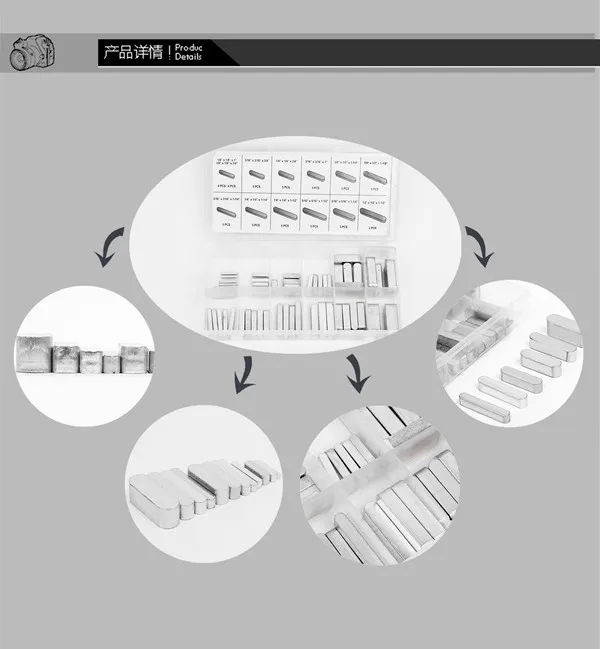 Specification | 1/8"x 1/8"x 3/4" 4pc 1/4"x 1/4"x 1-1/2" 5pc 1/8"x 1/8"x 1" 4pc 5/16"x 5/16"x 1-1/4" 5pc 3/16"x 3/16"x 3/4" 5pc 5/16"x 5/16"x 1-1/2" 5pc 3/16"x 3/16"x 1" 5pc 3/8"x 3/8"x 1-1/4" 5pc 3/16"x 3/16"x 1-1/4" 5pc 3/8"x 3/8"x 1-1/2" 5pc 1/4"x 1/4"x 3/4" 5pc 1/2"x 1/2"x 1-1/2" 2pc 1/4"x 1/4"x 1-1/4" 5pc |